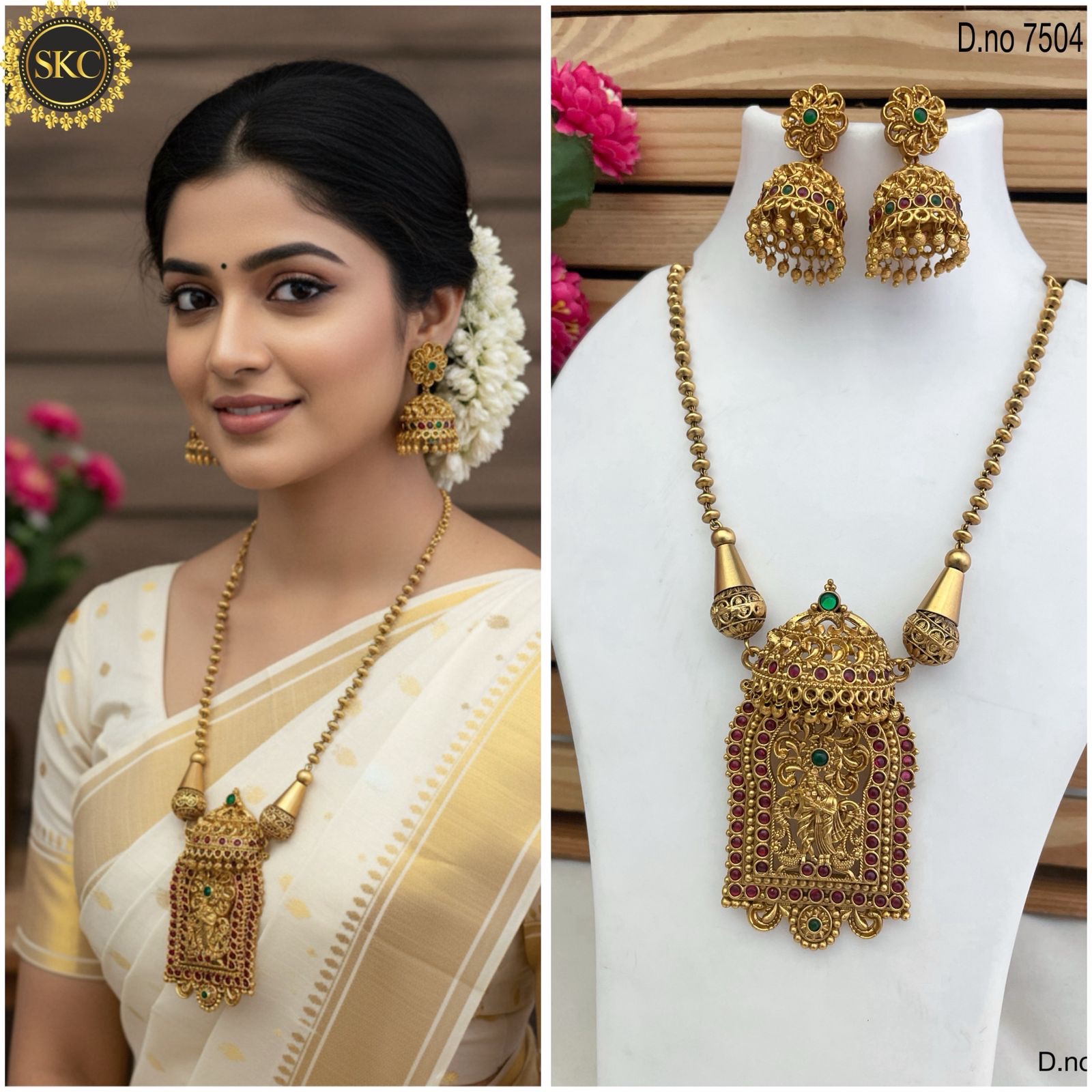 Adorn yourself with the timeless beauty of this Antique Temple Lakshmi Necklace Set, featuring a handcrafted pendant with ruby stones and antique gold polish. The long haram design highlights intricate temple motifs and a divine Lakshmi idol. Matching ruby jhumka earrings complete the look, making it ideal for weddings, poojas, and festive occasions. A perfect choice for women who love authentic South Indian craftsmanship.