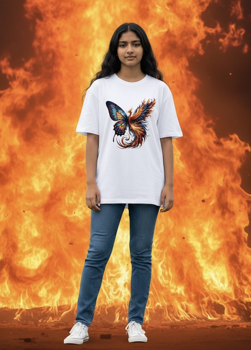Women’s Dreamy Butterfly-01 Oversized Tee. Soft, heavy-duty 200 GSM 100% cotton featuring vibrant butterfly graphics. Hip-Hop inspired fit, bio-washed, and pre-shrunk for lasting comfort and shape. Perfect for effortless street style.